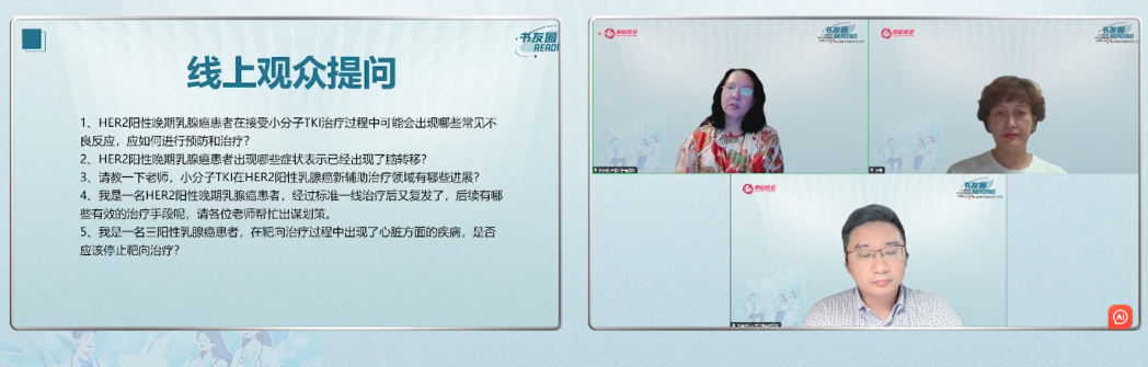编者按:2023年9月7日19:30,《书友圈》第三期开播,哈尔滨医科大学附属肿瘤医院张清媛教授(主持)与大连医科大学附属第二医院李曼教授(讲者)、复旦大学附属华东医院葛睿教授(讲者)齐聚《书友圈》,共同就小分子TKI在HER2阳性MBC中的治疗进展进行了介绍。