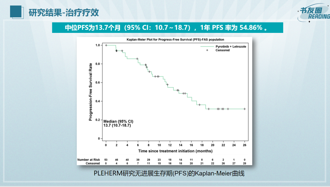PLEHERM研究是针对HR+/HER2+MBC的单臂、多中心2期试验,评估了吡咯替尼联合来曲唑治疗的有效性。2019年11月至2021年12月,入组了53例患者并接受研究药物治疗。患者每日口服400 mg吡咯替尼和2.5 mg来曲唑,直至疾病进展、出现无法接受的毒性或患者撤回知情同意。主要终点是研究者根据《实体瘤疗效评价标准》(Response Evaluation Criteria in Solid Tumors)1.1版评估的临床获益率(CBR)。