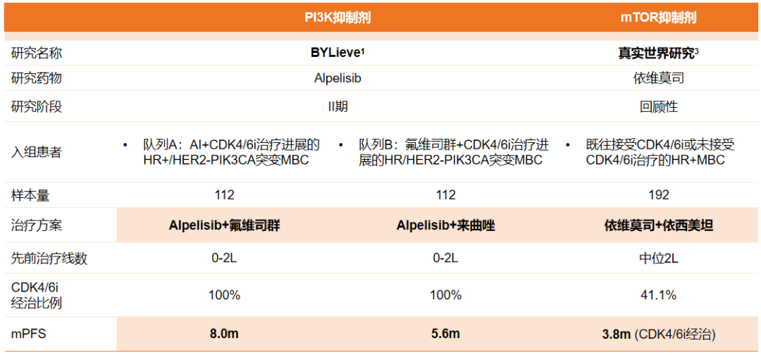 △CDK4/6i治疗进展后mTOR-PI3Ki治疗研究(以上研究中选用针对不同患者类型的不同治疗方案,非头对头研究,仅作数据列举,建议谨慎解读)