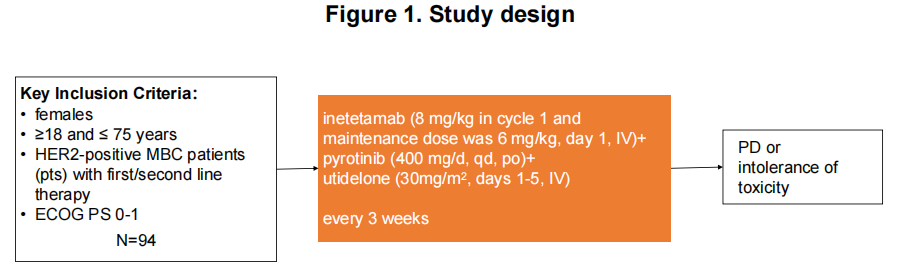 基于此,我们发起了IPU研究来验证这个设想。鉴于当前以曲妥珠单抗为代表的单克隆抗体药物已经广泛应用于临床,因此,我们在试验设计之初大分子单抗就选择了伊尼妥单抗,TKI药物选择了吡咯替尼,化疗药物我们选择了埃坡霉素类似物、抗微管抑制剂优替德隆。选择优替德隆是因为其在晚期乳腺癌患者中显示出了良好的抗肿瘤活性,在相关临床研究中也看到了其在三阴性乳腺癌、HER2阳性乳腺癌、HR阳性乳腺癌中都有非常好的表现。基于上述研究结果和目前的临床需求,我们团队设计了优替德隆联合伊尼妥珠单抗和吡咯替尼的三联治疗方案,以探索新的化疗药物与大小分子联合应用在HER2阳性晚期乳腺癌患者中的疗效与安全性。在研究开展过程中,PHILA研究(吡咯替尼+曲妥珠单抗+多西他赛)结果公布,这一结果的公布奠定了抗HER2大分子+小分子TKI联合化疗在HER2阳性晚期一线治疗地位,也证实了我们这一想法的正确性。