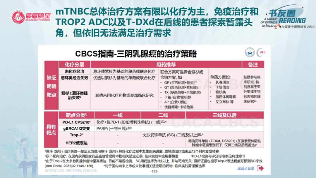 郑亚兵教授提到,当前mTNBC总体治疗方案有限,总体治疗格局形成了以化疗为主,免疫治疗和Trop-2 ADC以及T-DXd在后线的患者治疗探索中暂露头角,但依旧无法满足患者的治疗需求。