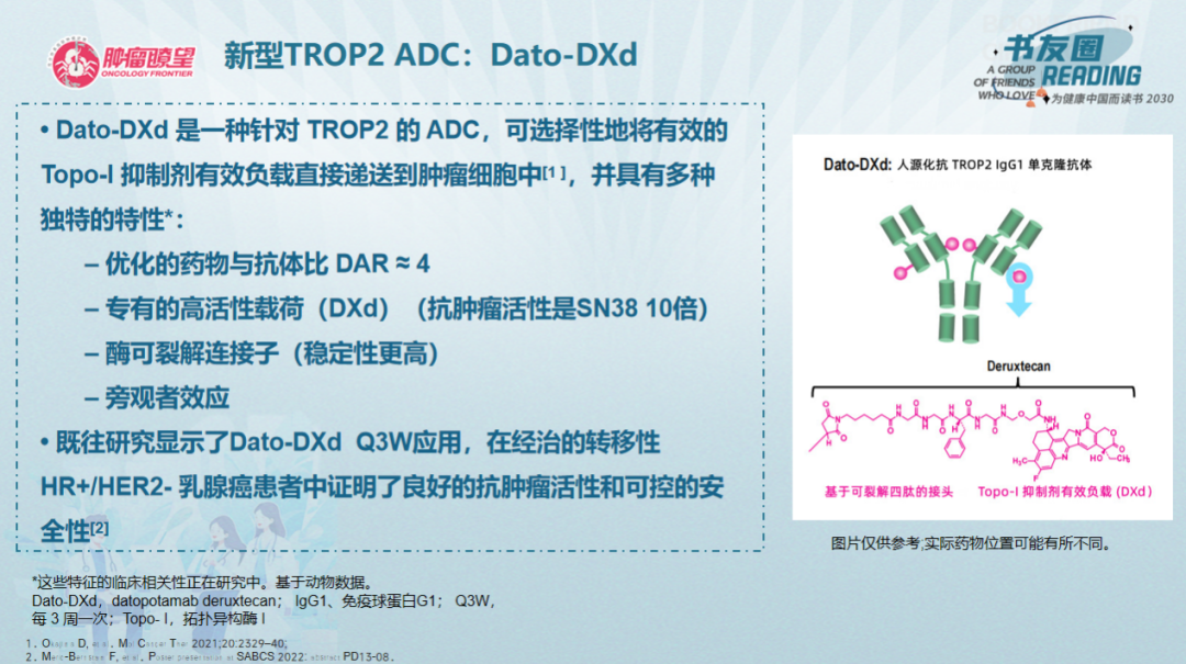 Dato-DXd是一种针对Trop-2的ADC,可选择性地将Topo-Ⅰ抑制剂有效负载直接递送到肿瘤细胞中,并具有多种独特的特性:优化的药物抗体比(DAR≈4);专有的高活性载荷(DXd)(抗肿瘤活性是SN38 10倍);可裂解连接子(稳定性更高);旁观者效应。既往研究结果显示,Dato-DXd在经治的转移性HR+/HER2-乳腺癌患者中有良好的抗肿瘤活性和可控的安全性。本次ESMO大会上,Dato-DXd在HR+/HER2-晚期乳腺癌的首个Ⅲ期研究TROPION-Breast01的结果进行了公布。