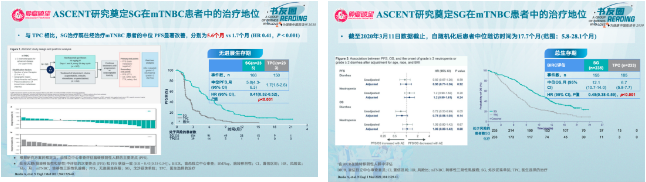 关键性Ⅲ期ASCENT研究数据显示,既往接受过二线以上标准化疗的mTNBC患者,SG相比医生选择的单药化疗(TPC)显著改善患者的PFS(5.6 vs 1.7个月,HR=0.39)和OS(12.1 vs 6.7个月,HR=0.48)。