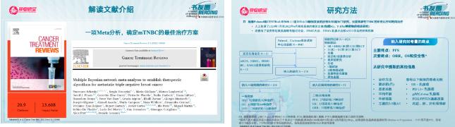 随后,令晓玲教授对一篇旨在通过网络荟萃分析方法确定mTNBC的最佳治疗方案的文献进行了解读。研究者检索Pubmed和CENTRAL中2000.1.1至2020.6.30期间发表的所有II/III期RCT研究,比较mTNBC的所有化疗和靶向治疗,人工收录了2020年7月至2022年6月期间发表的相关文章(包括SG、T-DXd等药物的相关研究)。主要终点为PFS,次要终点包括ORR、OS和安全性。