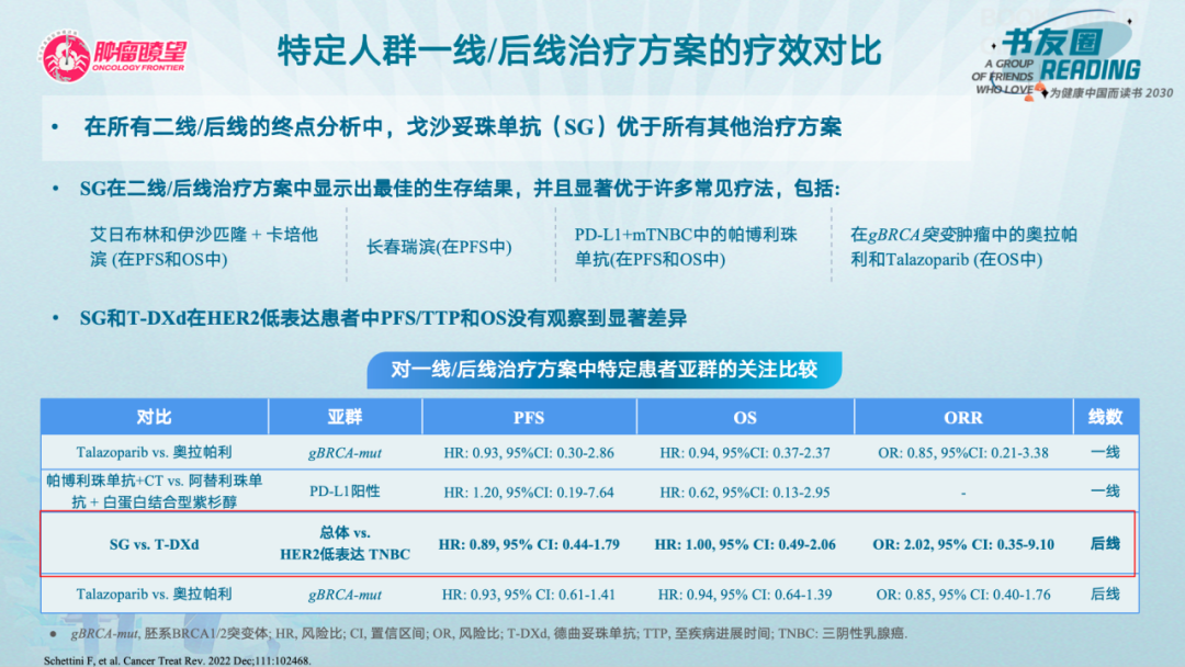 小结:TNBC预后差,仍存在较大未被满足的治疗需求;近年来,多种新型药物已被批准用于治疗TNBC,然而,大多数方案尚未进行直接对比。荟萃分析根据不同治疗线数确定mTNBC的最佳治疗方案,结果显示在二线/后线治疗方案中,SG在所有终点上的表现都优于该分析中的所有其他治疗(包括T-DXd);SG治疗相关不良事件较为常见且易管理。2023 ESMO HER2低表达BC共识推荐SG为优先选择方案。最新真实世界研究结果证实,mTNBC越早接受SG治疗,OS越长,进一步确认SG在mTNBC治疗中的重要地位。