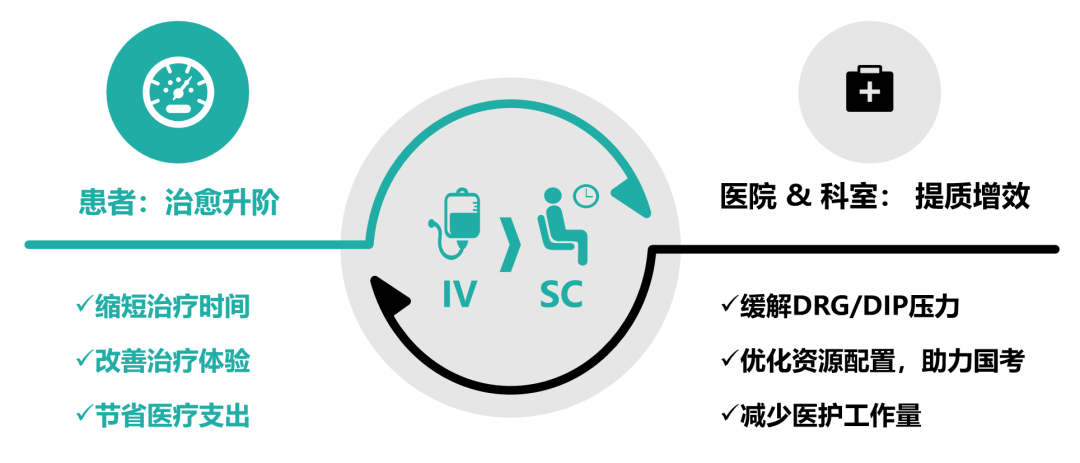 随着预后改善和医学理念的进步,抗肿瘤治疗不再单纯以“保生存”为目标,“提高生活质量、回归社会”也成为许多患者的核心诉求,传统静脉注射(IV)的大分子药物需要患者反复住院或门诊输液,相较于口服(PO)和皮下(SC)给药,静脉给药过程繁冗、不方便,且感染、出血等风险大。另一方面,反复住院和门诊输液治疗也增加了医院运转负荷和医疗系统支付压力。近年来,国家鼓励“以患者为中心”的新药研发,引入患者报告结局(PRO)来评估患者的生活质量。新药研发不仅包括新靶点药物,也应包括创新剂型或改良剂型。与此同时,随着医改深入,DRG/DIP等新管理模式下也需要更多高效便捷的治疗方案。