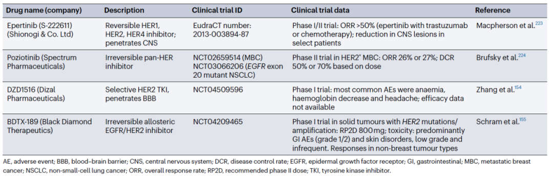 DZD1516是一种口服的、可逆的和选择性的HER2 TKI,具有完全的血脑屏障渗透性。在异种移植小鼠模型(包括皮下、脑转移和软脑膜转移模型)中证实了肿瘤消退活性[60]。BDTX-189是一种EGFR/HER2改变和HER2野生型的口服、ATP竞争性、不可逆的小分子抑制剂,旨在保护EGFR野生型以最大限度地降低毒性[61]。BDTX-189在体内表现出对多种变构ERBB突变体的有效、持续失活。一项针对携带特异性变构HER2或HER3突变或其他EGFR/HER2改变的晚期实体瘤的I期试验正在进行中。早期数据显示,BDTX-189在HER2扩增的肿瘤和具有EGFR和HER2外显子20插入的非小细胞肺癌(NSCLC)患者中具有活性[61]