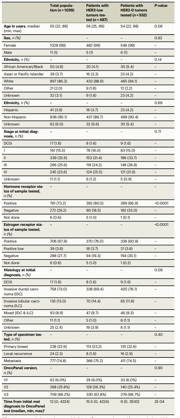 本研究纳入在丹娜·法伯癌症研究所前瞻性研究数据库中2013年7月1日至2020年12月31日mBC临床病理数据。入选患者为初治或复发的mBC患者,并根据美国临床肿瘤学会/美国病学学会(ASCO/CAP)标准确诊为HER2阴性患者;若无法检索到患者的免疫组化(IHC)信息、或存在IHC2+但无原位杂交(ISH)信息、或HER2阳性则均需排除。对上述所有mBC患者二代基因测序(NGS)的信息予以分析对比,并描述HER2-low和HER2-0的基因特征。