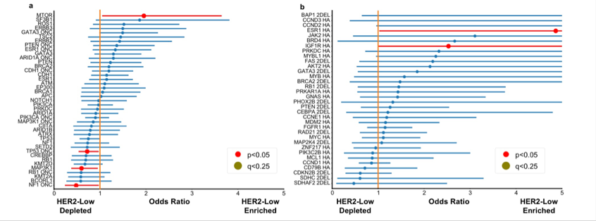 研究者对比了HER2-low和HER2-0的基因组图谱。Logistic回归用于解释背景突变或拷贝数突变率以及矫正ER状态。常见突变(在HER2-0或HER2-low样本中均>4%)分析显示,在HER2-low样本中主要为MTOR突变(比值比[OR]=1.95;95%CI,1.04-3.64;p=0.04),在HER2-0样本中则主要包括MAP3K1突变(OR=0.59;95%CI,0.40-1.00,p=0.03)、NF1致癌突变(OR=0.48;95%CI:0.24-0.97;p=0.04)、TP53致癌突变(OR=0.72;95%CI,0.53–0.97;p=0.03)。然而经矫正的多重假设检验分析显示,HER2-low和HER2-0之间的基因突变分布没有差异。在致癌CNV分析方面,仅显示HER2-low中ESR1扩增(OR=4.89,95%CI 1.02–23.13,p=0.05)和IGF1R扩增(OR=2.539,95%CI 1.00–6.40,p=0.05)富集,HER2-low和HER2-0中的致癌CNV并未改变(图4)。