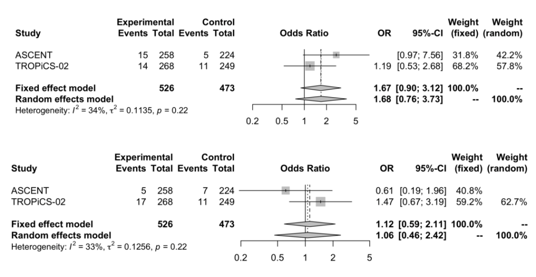 在安全性方面,一项荟萃分析纳入了ASCENT、TROPiCS-02两项研究999例患者,其中SG 526例,化疗473例。结果显示SG较化疗在≥3级[OR=1.89(1.46;2.44)]及全部等级[OR=2.15(1.66;2.7)]的中性粒细胞减少、白细胞减少、贫血以及其他非血液学毒性方面风险有所提升;但在发热性中性粒细胞减少[OR=1.68(0.76;3.73)]和治疗中断[OR=1.06(0.46;2.42)]方面二者并无差异[17]