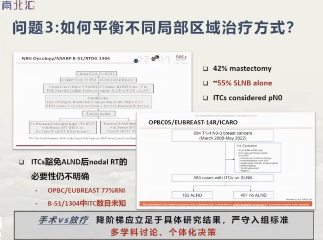 邱鹏飞教授介绍到,如今外科和放疗医生都在探索降阶梯治疗。现有的循证医学证据表明,新辅助后放疗的降阶梯似乎也是安全的,如何平衡不同局部治疗方式就成了新的问题。临床医生都希望能像NRG Oncology/NSABP B-51/RTOG 1304研究那样,做到外科和放疗的双降阶梯。同时我们也发现该研究中并未展示ITC的具体数目,而OPBC05/EUBREAST-14R/ICARO研究中,SLN出现ITC且未接受ALND的患者绝大多数进行了区域淋巴结放疗。所以对于不同局部区域治疗方式的降阶梯,我们应该立足于具体临床研究的入组标准和研究结果,通过多学科协作为患者制定更为个体化的治疗策略。