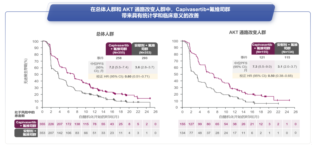 虽然PAM通路已被证实是CDK4/6i耐药的主要机制之一,但该通路上仅AKT抑制剂Capivasertib的CAPItello-291研究唯一取得了CDK4/6i经治人群的Ⅲ期研究数据,在后CDK4/6i时代的循证医学证据级别高。该研究结果显示,全人群中,Capivasertib+氟维司群较氟维司群单药改善mPFS,为7.2个月vs 3.6个月;在中国人群中,mPFS为6.9个月vs 2.8个月,无论AKT是否突变均有获益,且各亚组获益一致,安全性较好,从而获得了国内外指南推的一致推荐。