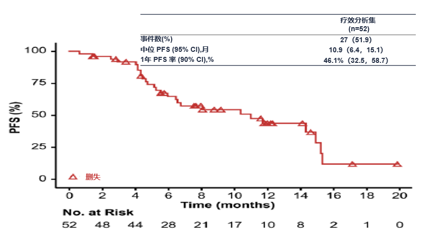 队列2为免疫联合贝伐珠单抗及白蛋白紫杉醇诱导治疗,随后给予免疫联合贝伐珠单抗维持治疗。患者1年PFS率为46.1%,其90%CI:32.5~58.7下限高于历史对照化疗数据的7%,达到主要研究终点;患者中位PFS为10.9个月,同样展示了良好的疗效。