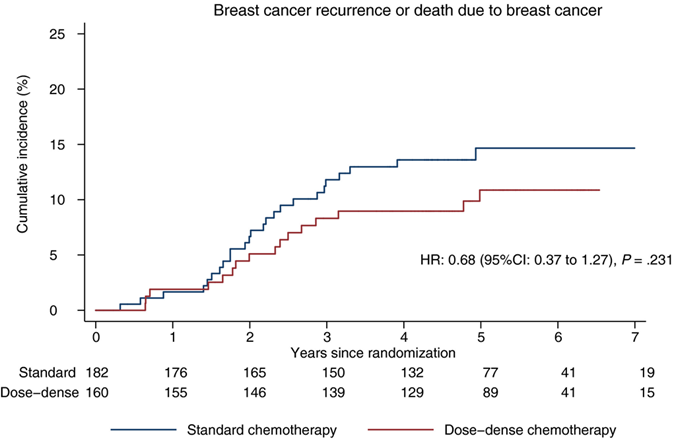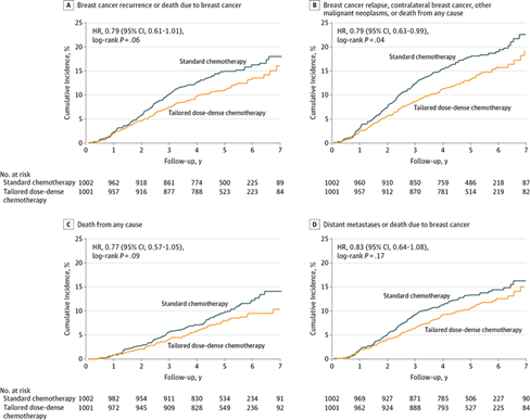 2016年,PANTHER研究在JAMA上公布了中位随访5.3年时首次分析结果。两组共269例无乳腺癌复发生存,其中定制剂量密集化疗118例、对照组151例。两组无乳腺癌复发生存分别为88.7%和85.0%,无显著差异(HR=0.79,P=0.06),且两组的总生存、无远处病变生存也无显著差异。定制剂量密集化疗组仅5年无事件生存显著高于对照组,分别为86.7%和82.1%(HR=0.79,P=0.04)。3或4级血液毒性反应可见于定制剂量密集化疗组527例(52.6%)、对照组336例(36.6%)[7]