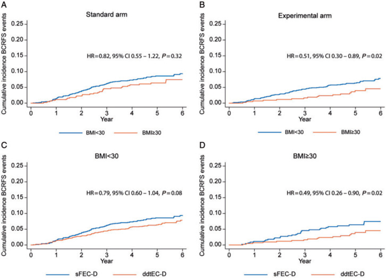 2018年,PANTHER研究的研究者对PANTHER研究中肥胖人群(BMI>30)亚组进行了回顾探索性分析。因为,肥胖被认为是肿瘤患者预后不良因素之一,相较于正常体重患者,肥胖患者乳腺癌复发或死亡的风险增加约三分之一[8]。猜测其可能的原因之一是由于化疗剂量不足所导致,但临床证据很少。由于PANTHER研究中采用了个体化的定制剂量密集方案,对于肥胖患者可以部分避免化疗剂量不足的问题。研究者假设定制剂量密集方案可使肥胖患者的剂量合理且结局改善,并发表在《肿瘤学报》上。结果表明肥胖患者与非肥胖患者(BMI<30)相比,无乳腺癌复发生存有所改善[HR=0.51,P=0.02]。此外,与标准治疗相比,定制剂量密集化疗组疗效仅与肥胖患者的无乳腺癌复发生存改善有关(HR=0.49,P=0.022),与非肥胖患者中无关(HR=0.79,P=0.089)。不同表柔比星剂量水平或BMI组之间的毒性没有差异。提示对于早期乳腺癌肥胖患者,采用定制剂量密集方案可以在不增加毒性的情况下改善肥胖患者的治疗效果[9]