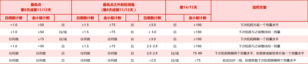 表2.定制剂量密集型方案试验组患者根据白细胞和血小板数值治疗方案调整标准
