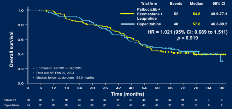 Dr.Yeon Hee Park:The overall survival results were quite impressive.The Palbociclib arm showed a median overall survival of 54.8 months,compared to 57.8 months for the Capecitabine arm.While the survival rates are close,the progression-free survival and the consistency of the PFS benefit in the Palbociclib arm highlight its effectiveness.