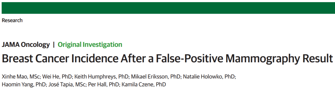 5.Mao X,He W,Humphreys K,et al.Breast Cancer incidence after a false-positive mammography result[J].JAMA oncology,2024,10(1):63-70.