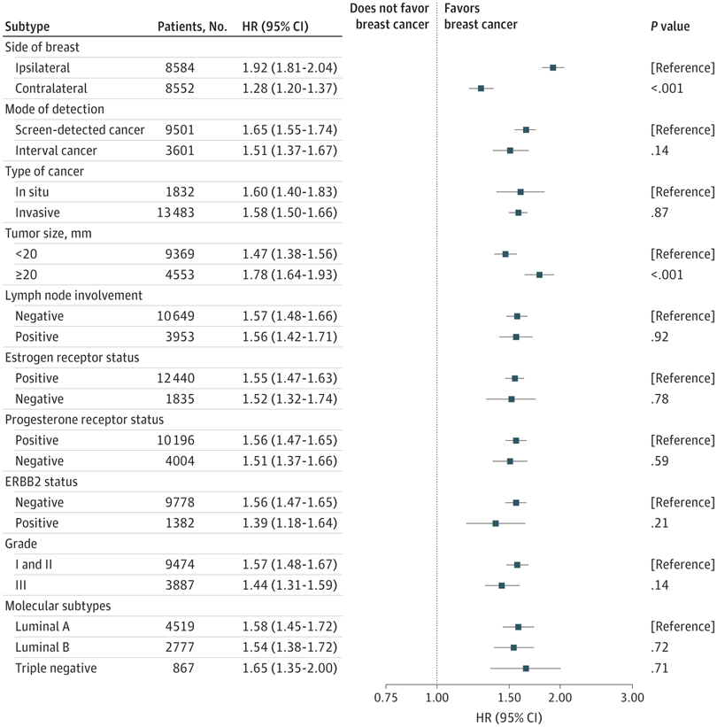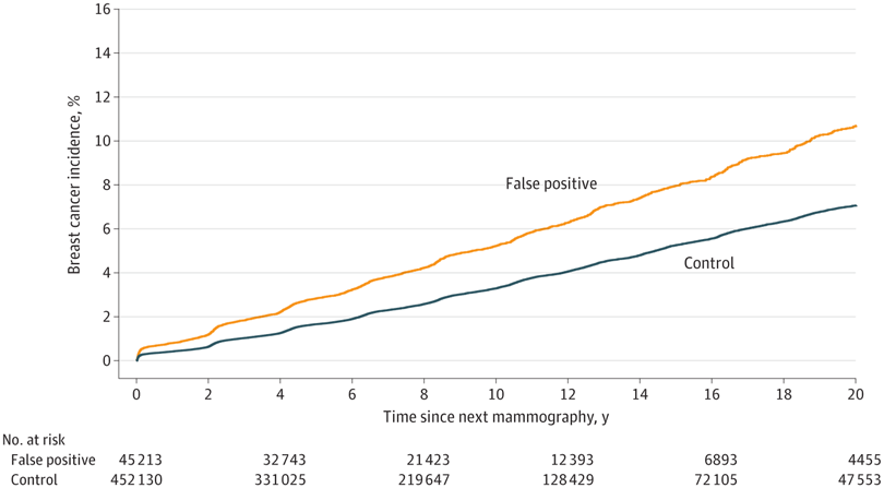 乳腺癌死亡率的增加很可能与乳腺癌发病率增加相关,因为乳腺癌患者的预后不会因之前是否为假阳性结果而有所不同。将假阳性乳腺癌患者的预后与没有假阳性乳腺癌患者的预后进行比较,HR为1.05(95%CI,0.89-1.25)。