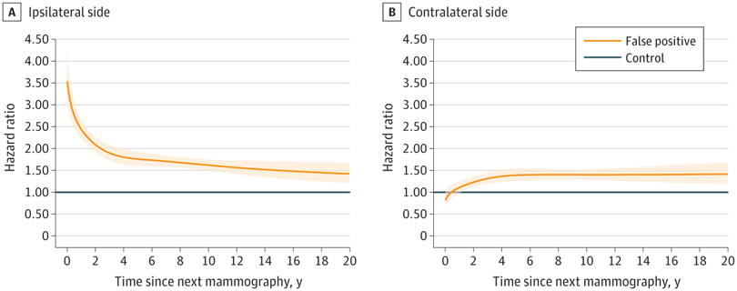 此外,该研究还分析了假阳性女性同侧和对侧乳腺癌风险的时间依赖性特征。相比于无假阳性女性,假阳性人群的同侧乳腺癌风险在随访最初几年急剧下降,随后下降渐缓:前2年HR为2.57,2~4年HR为1.93,6~10年HR为1.69,10~20年HR为1.51。